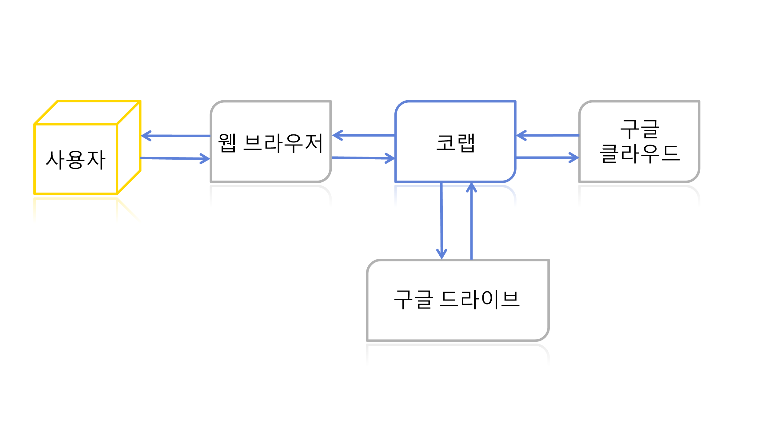 코랩은 웹 브라우저(Web Browser)를 통해 제어하고 실제 파이썬 코드 실행은 구글 클라우드의 가상 서버에서 이루어진다. 또한 코랩에서 만든 파일인 노트북은 구글 드라이브(Google Drive)에 저장하고 불러올 수 있다.