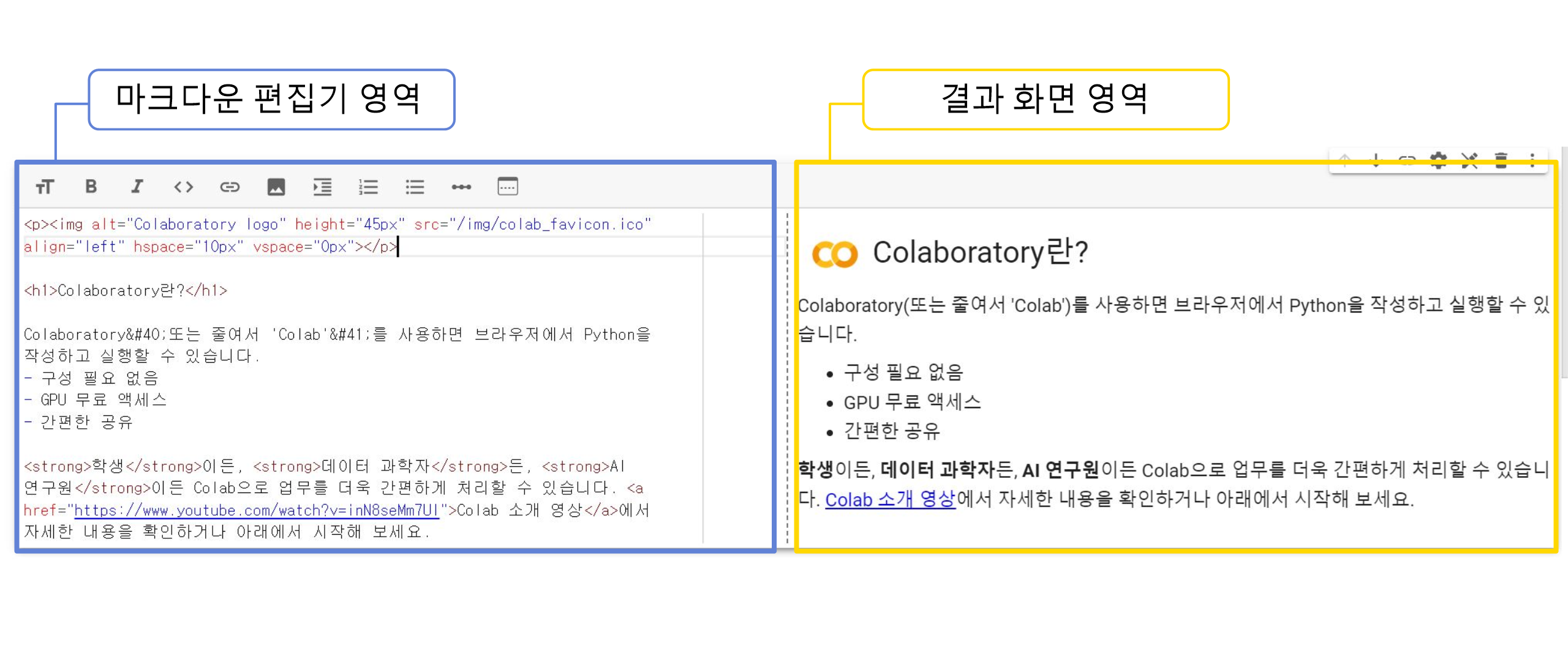 노트북에는 코드 셀과 텍스트 셀이 있고 셀의 내용을 수정할 경우 셀을 더블 클릭하거나 선택한 상태에서 Enter를 누르면 된다. 이때 웹 브라우저의 좌우 넓이에 따라 마크다운 편집기 영역과 결과 화면 영역이 상하 또는 좌우로 배치된다.