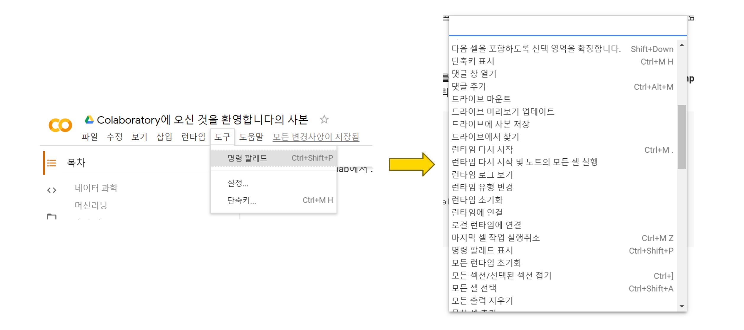 ํค๋ณด๋๋ก ์ฐพ์ ์คํํ ์ ์๋ ๋ช ๋ น ํ๋ ํธ๋ฅผ ์ฌ์ฉํ๋ฉด ๋๋ค. ๋ฉ๋ด์์ [๋๊ตฌ > ๋ช ๋ น ํ๋ ํธ]๋ฅผ ์ ํํด์ ํ์ํ ๊ธฐ๋ฅ์ ๊ฒ์ํ๋ฉด ๋๋ค.