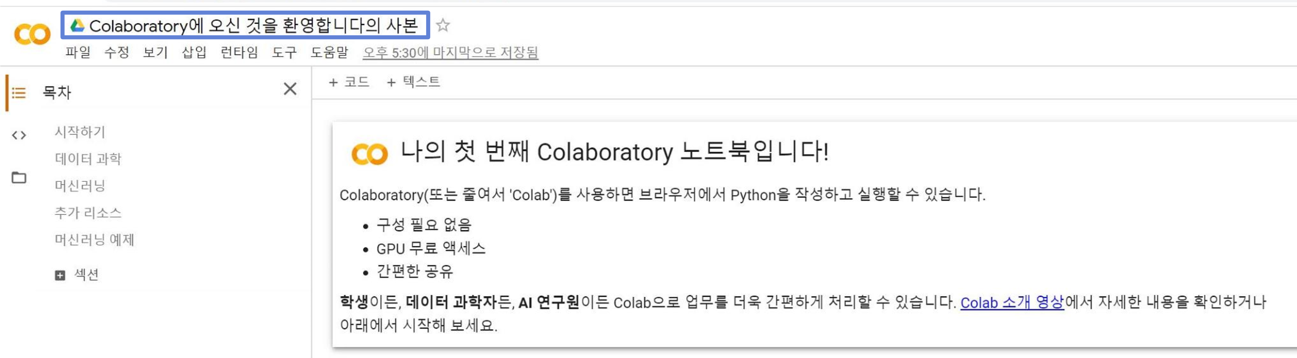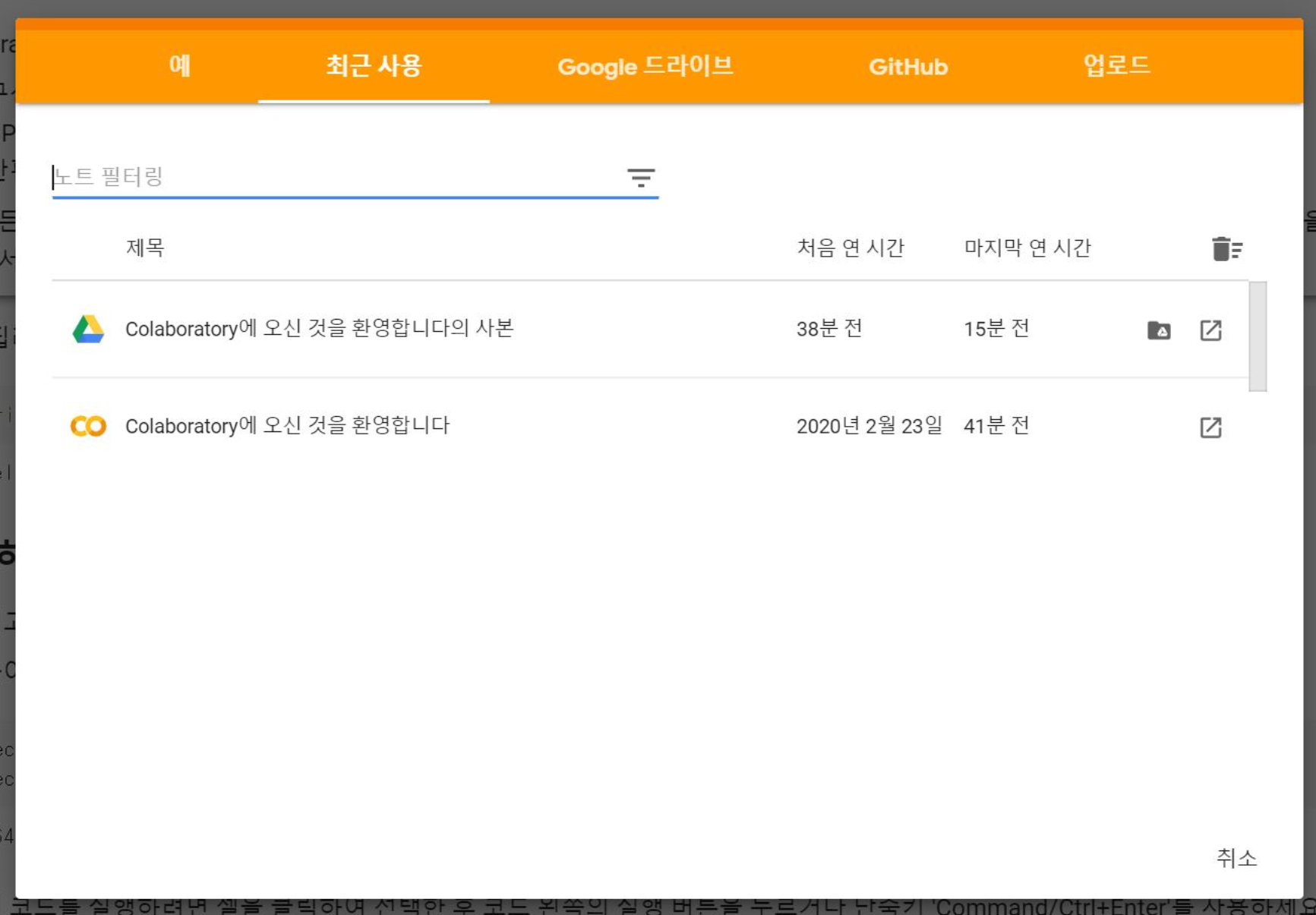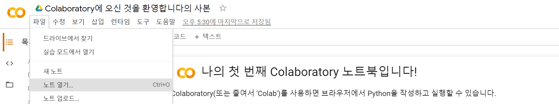 ์ฝ๋ฉ ๋ฉ๋ด์์ [ํ์ผ > ๋ ธํธ ์ด๊ธฐ]๋ฅผ ์ฌ์ฉํ๋ฉด ๋ ธํธ๋ถ์ด๋ ๊ตฌ๊ธ ๋๋ผ์ด๋ธ์ ์๋ ๋ ธํธ๋ถ์ ์์ฝ๊ฒ ์ด ์ ์๋ค.