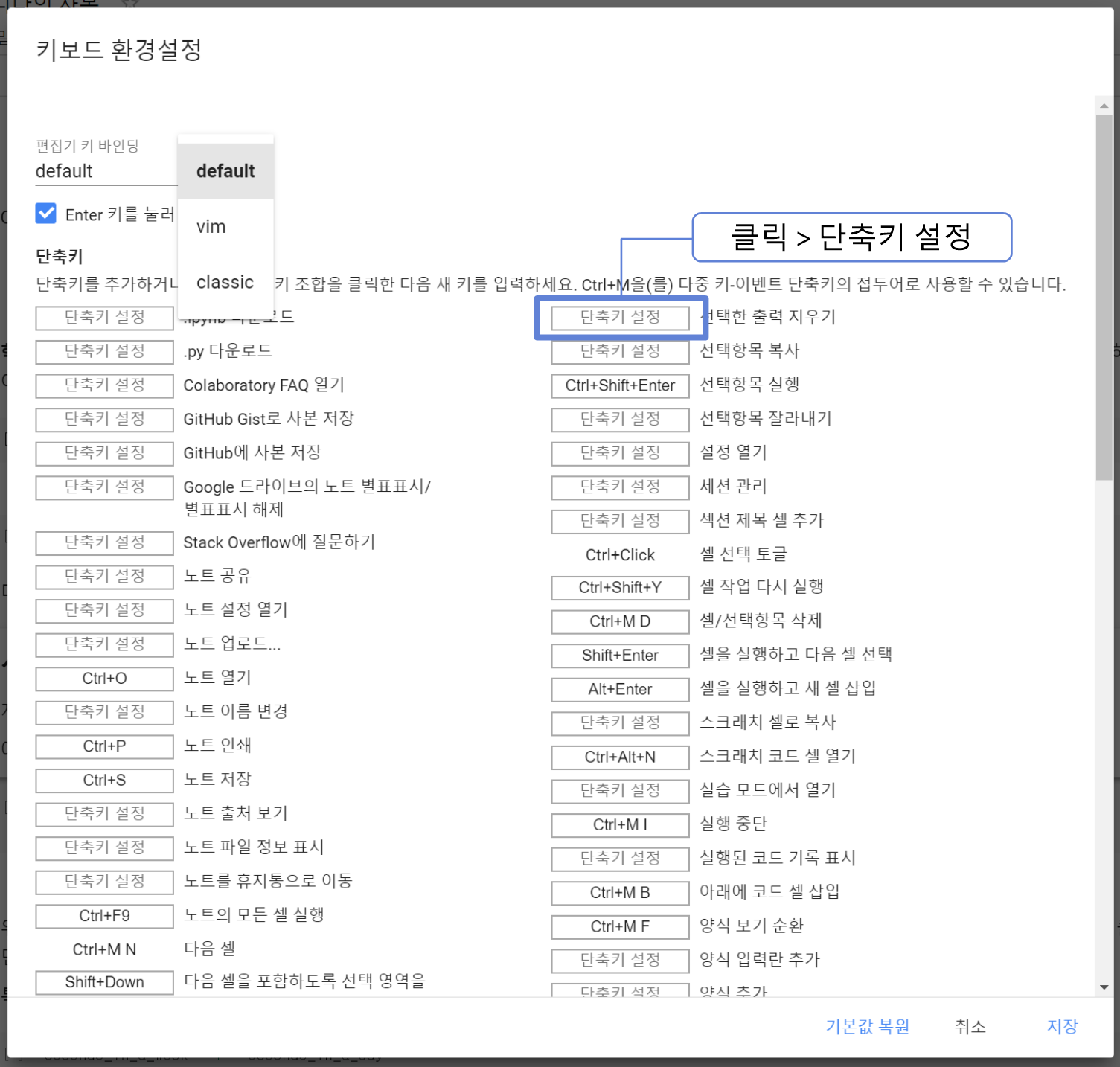 ๋จ์ถํค๋ ์ฌ์ฉ์๊ฐ ์ํ๋๋๋ก ์ถ๊ฐํ๊ฑฐ๋ ๋ณ๊ฒฝํ ์ ์๋ค. ๋ฉ๋ด์์ [๋๊ตฌ > ๋จ์ถํค]๋ฅผ ์ ํํ๊ฑฐ๋ Ctrl + M H๋ฅผ ๋๋ฌ ์ ์ฒด ๋จ์ถํค๋ฅผ ๋ณผ ์ ์์ผ๋ฉฐ ํค๋ณด๋ ํ๊ฒฝ์ค์ ํ๋ฉด์ด ๋์ค๋ฉด [๋จ์ถํค ์ค์ ]์ ๋๋ฅธ ๋ค์ ์ค์ ํ ์ ์๋ค.