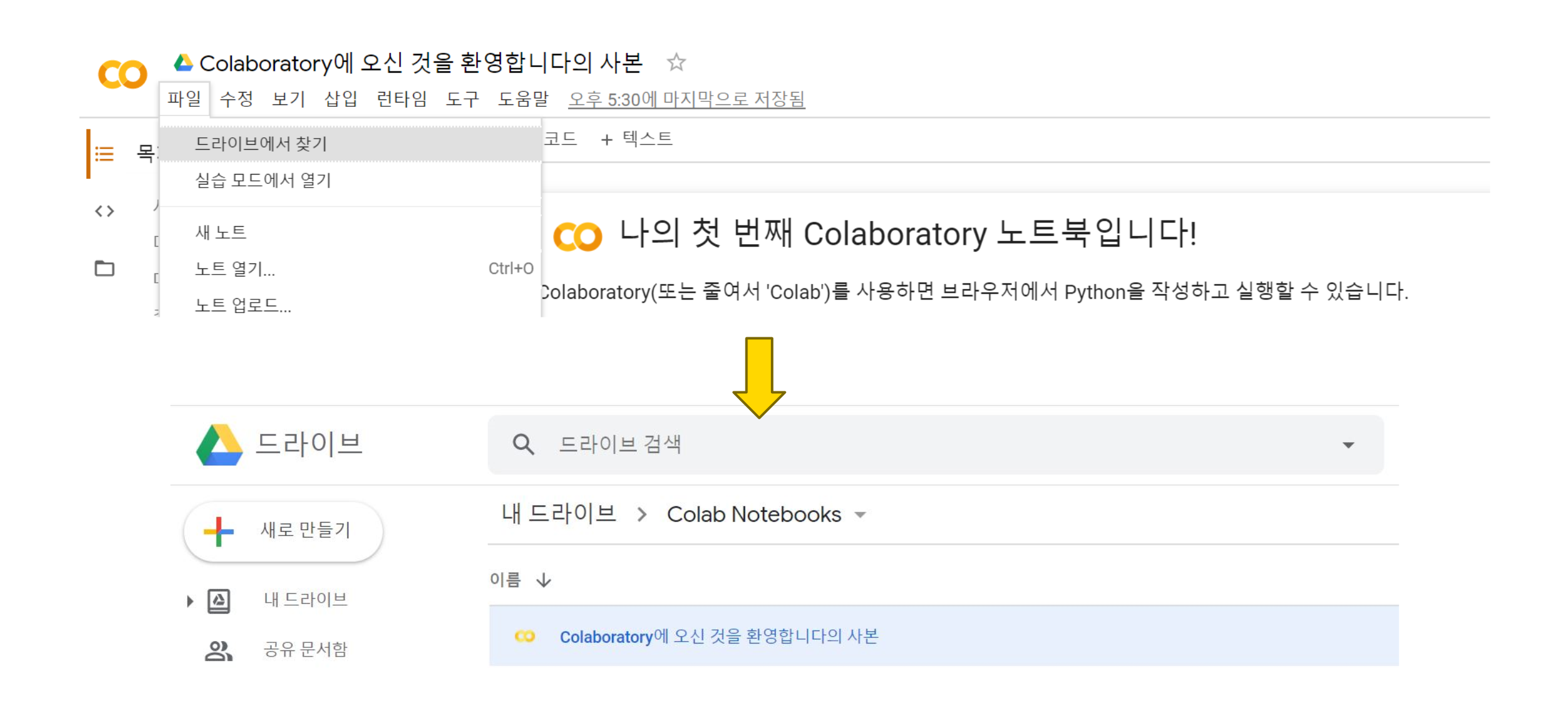 ๋ฉ๋ด์ [ํ์ผ > ๋๋ผ์ด๋ธ์์ ์ฐพ๊ธฐ]๋ฅผ ์ ํํ๋ฉด ๊ตฌ๊ธ ๋๋ผ์ด๋ธ์ 'Colab Notebooks' ํด๋ ์์น์ ์ ์ฅ๋ ๋ ธํธ๋ถ์