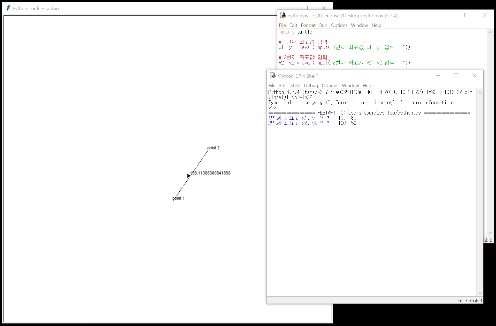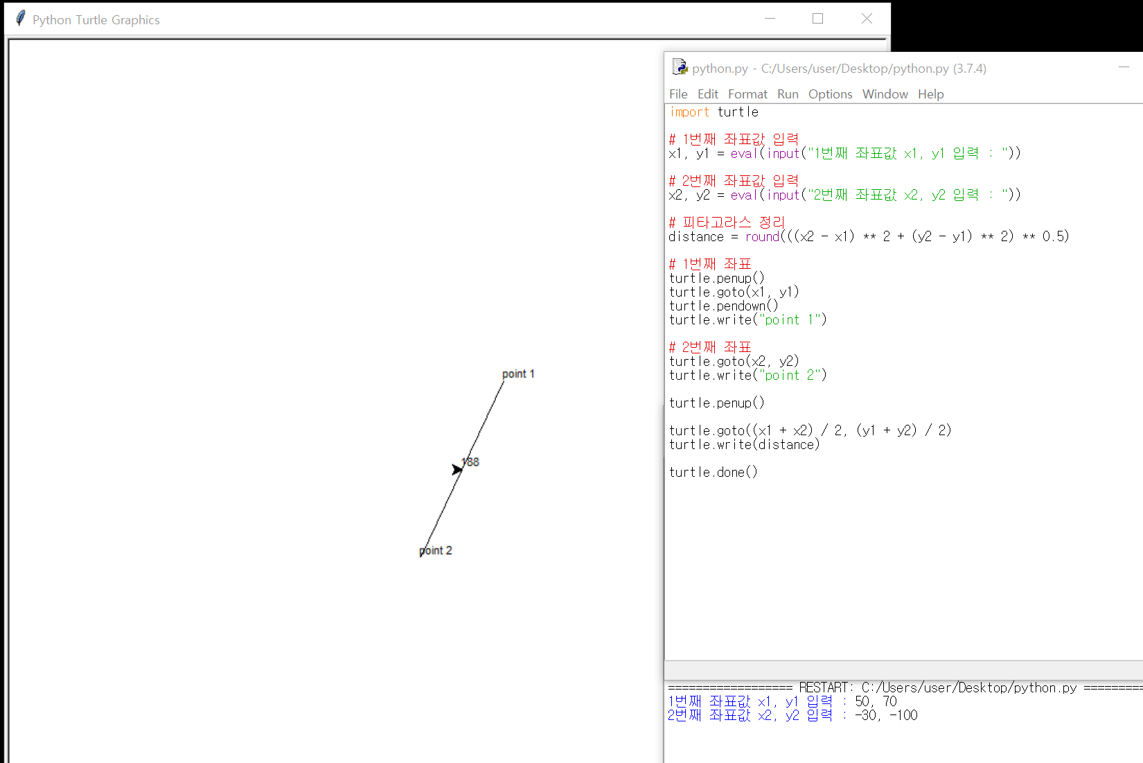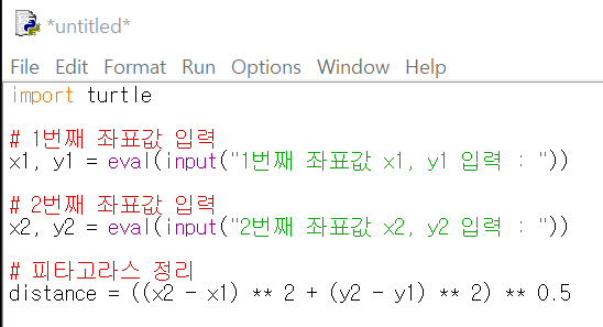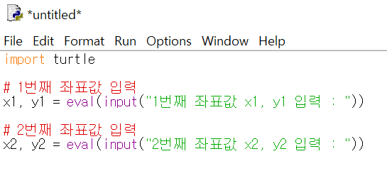 ์ฒซ ๋ฒ์งธ๋ก turtle ๋ชจ๋์ import ํ๊ณ ์ขํ๊ฐ์ ์ ๋ ฅ๋ฐ์ ์ฝ๋๋ฅผ ์์ฑํด๋ณด์.