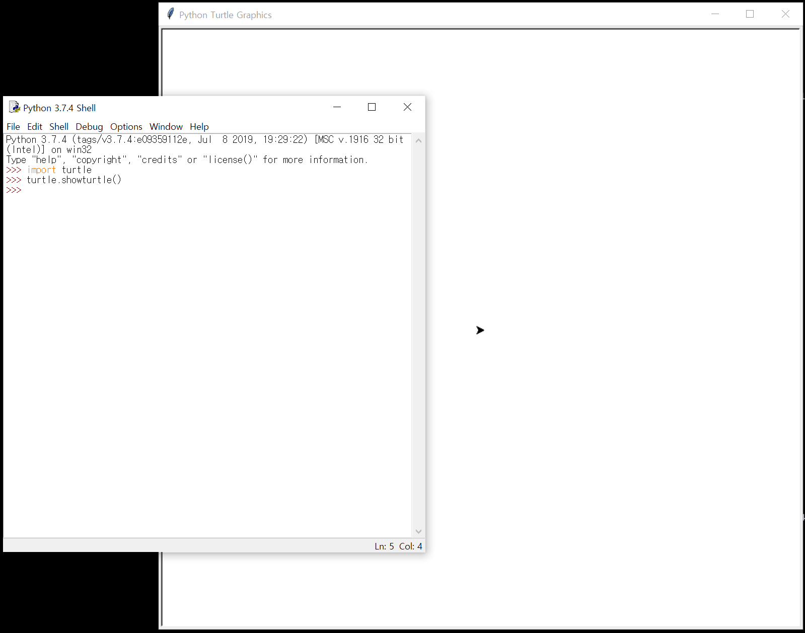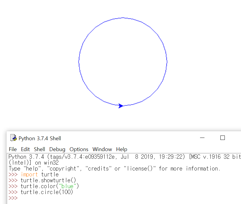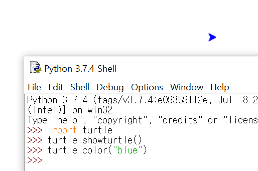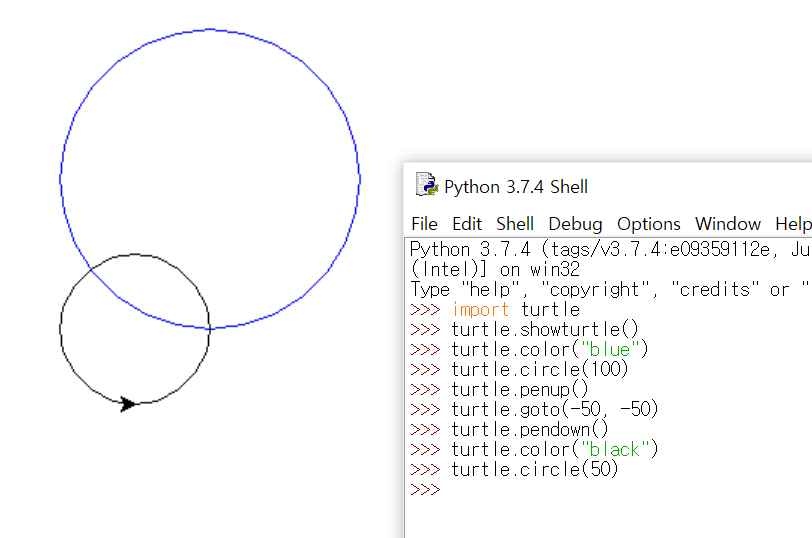 ๊ทธ๋ค์ showturtle() ํจ์๋ฅผ ์ฌ์ฉํ์ฌ ์บ๋ฒ์ค๋ฅผ ํ์ธํ๋ค.