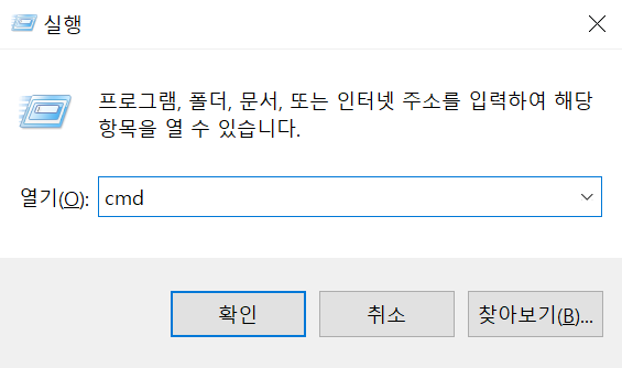 작업표시줄의 검색창 또는 Win+R을 누르고 "cmd"를 입력 후 엔터키 or 확인을 클릭.