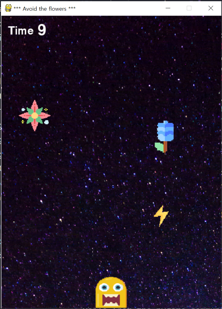 이때 떨어지는 아이템의 좌표는 랜덤이며 속도는 값이 정해져 있고 캐릭터가 완전히 꽃을 피하면 다음 꽃이 떨어지도록 한다.